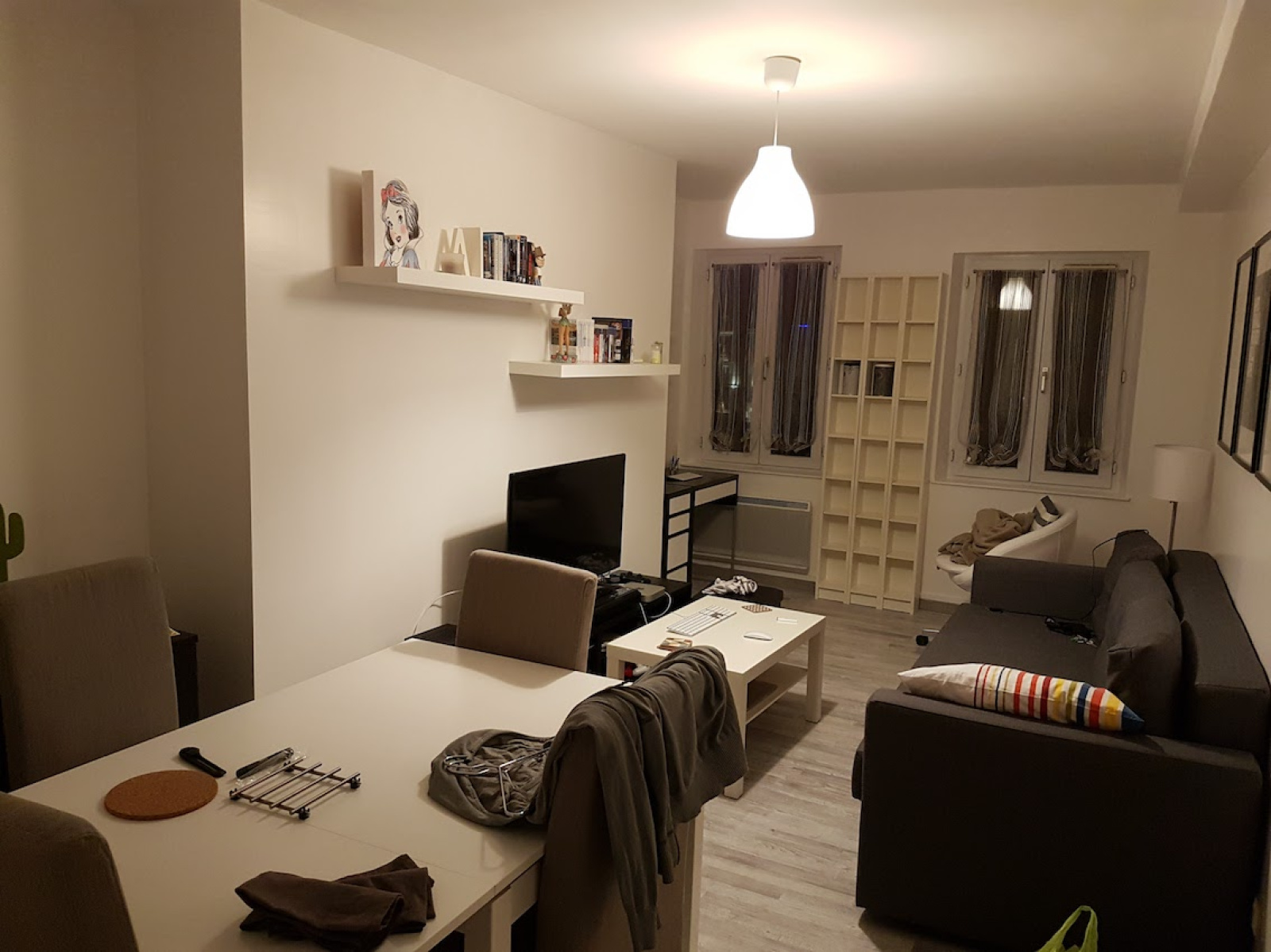 Une entrée avec rangement, une cuisine aménagée, un séjour, une chambre, une salle de bains et wc indépendant.