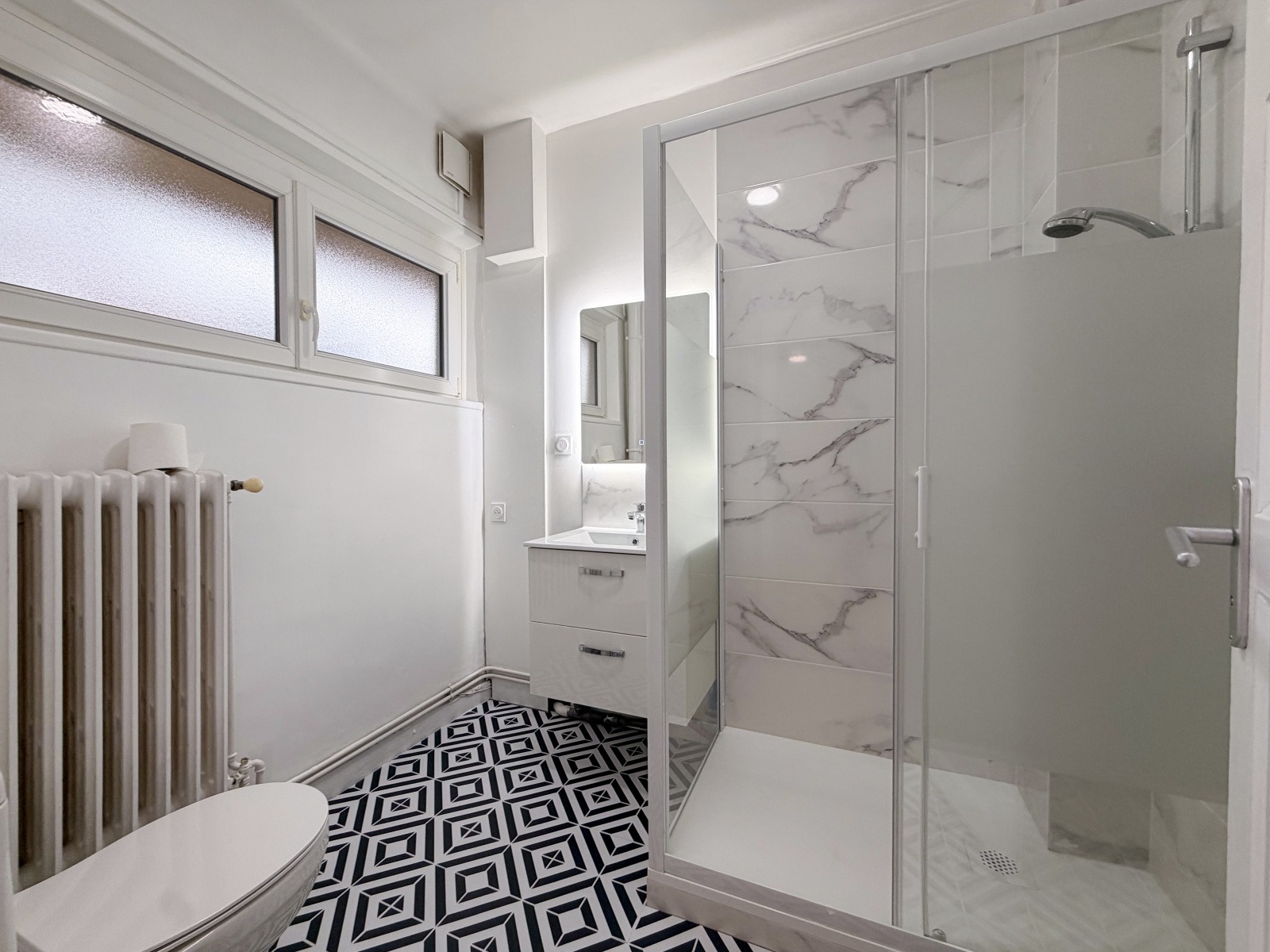 Fenêtres en PVC double vitrage avec store électrique, chauffage individuel au gaz.