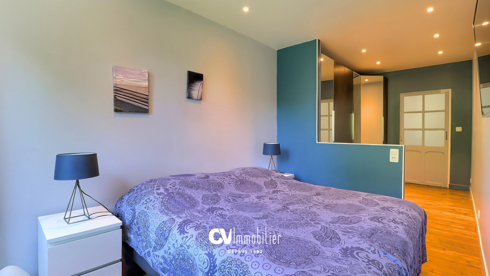 Une entrée avec placards, un salon, une cuisine aménagée ouverte sur la salle à manger, 3 chambres, une salle d'eau avec baignoire, douche et double vasque, un wc indépendant